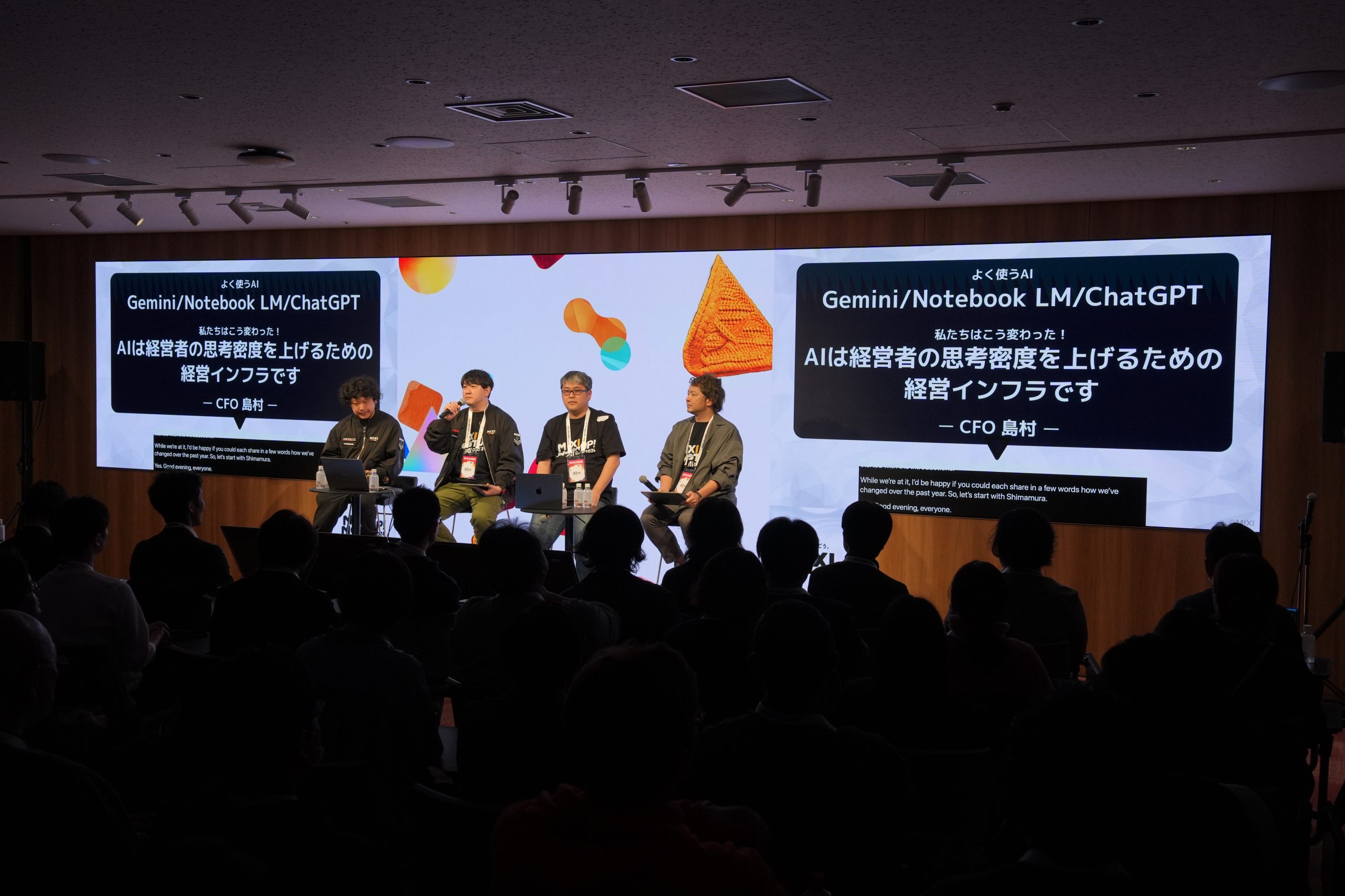 全17本部・23事例にわたるAI活用の実践をセッション形式で公開した本イベントのClosing Sessionでは、取締役 上級執行役員の村瀨龍馬氏が「AIのその先へ」と題した講演を行い、続いてCFO島村恒平氏、CTO吉野純平氏、CDO(チーフデザインオフィサー)横山義之氏を交えたパネルディスカッションが行われた。