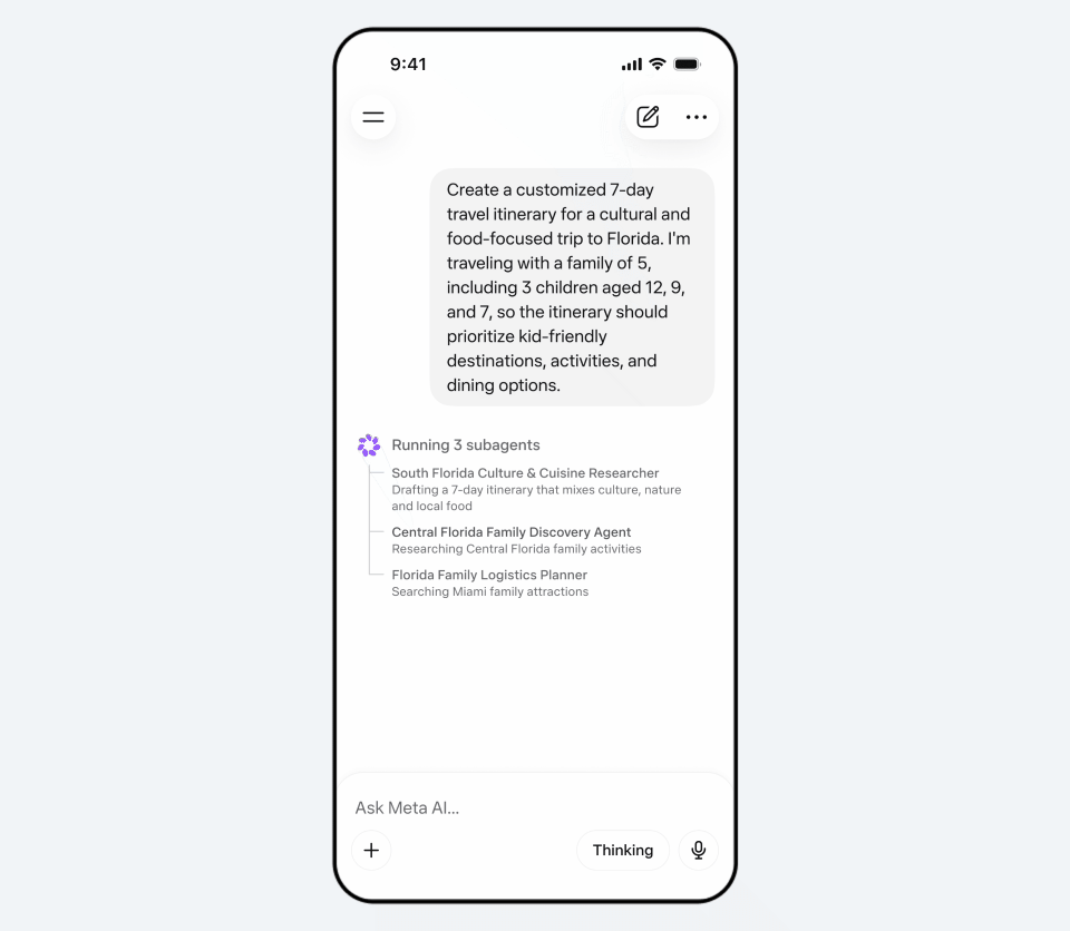Muse SparkはMSLが9ヵ月かけてAIスタックをゼロから再構築したモデルで、小型・高速でありながら科学・数学・健康などに関する複雑な質問に対応できる推論能力を備える。現在、Meta AIアプリおよびウェブ版のmeta.aiに搭載されており、複雑な推論やマルチモーダルタスクをサポートしている。